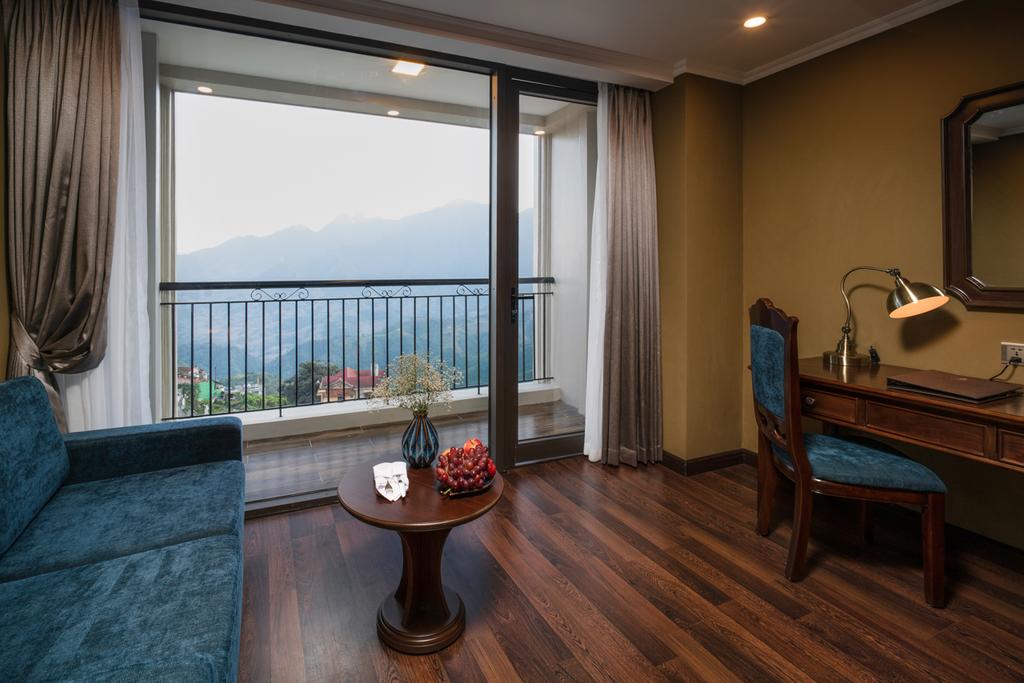 Nhìn từ xa, khách sạn như tòa lâu đài lộng lẫy ẩn hiện trong làn sương mờ ảo của phố núi. Bước chân vào khách sạn, du khách thực sự bị ấn tượng bởi những họa tiết hoa văn đẹp mắt trên các sản phẩm thổ cẩm được sử dụng làm điểm nhấn cho không gian nội thất từ các bức tranh treo tường, gối, thảm,… Kết hợp tông màu trầm nền nã và những vật dụng quen thuộc được biến tấu khác lạ, xu hướng “vinh danh bản sắc” đã trở thành chủ đề xuyên suốt trong thiết kế nội thất của khách sạn.